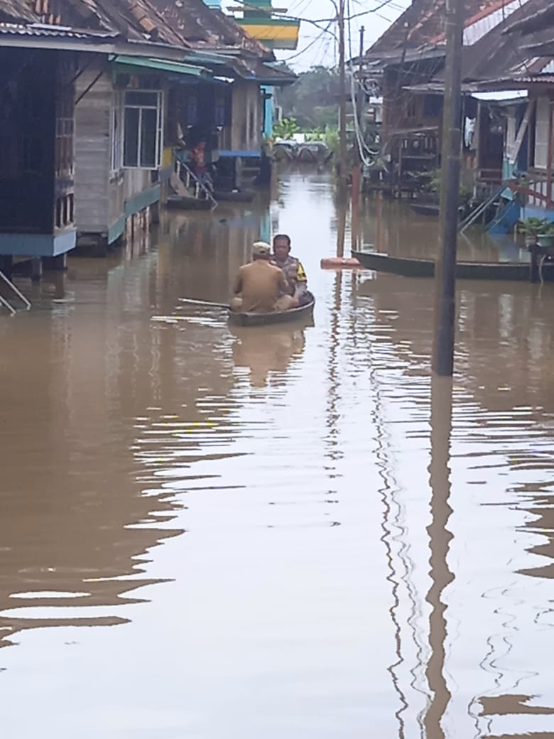 “Akibat curah hujan cukup tinggi merendam beberapa pemukiman warga di seberang tepatnya di Tahtul Yaman , dari Polsek Pelayangan melakukan pengecekan di pemukiman yang terendam banjir tersebut guna memastikan situasi dan kondisi warga dengan menggunakan perahu (11/03) pukul 09.30 wib.